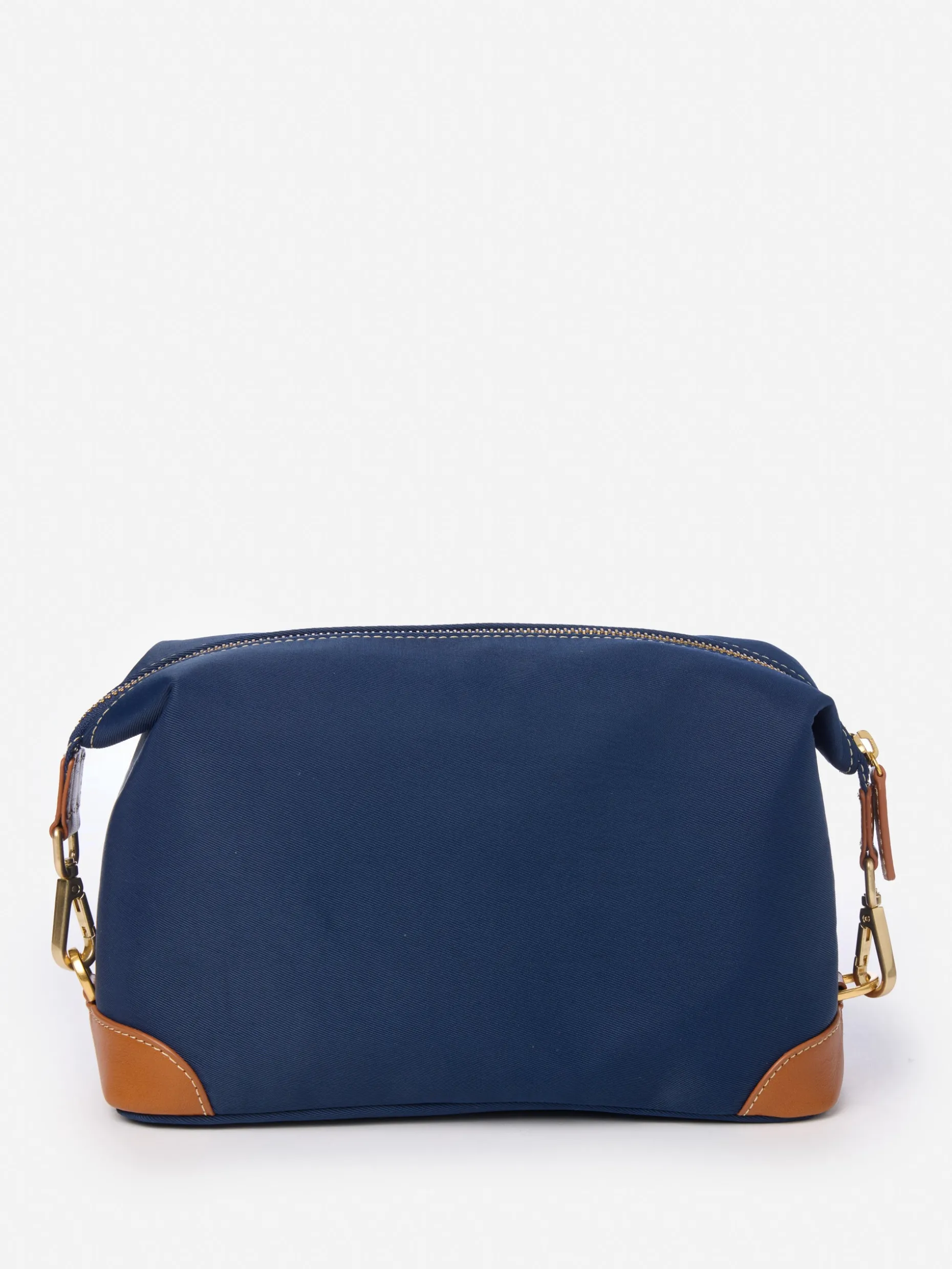 This nautical-inspired pouch serves its purpose in style whether it’s being put to use atop a home sink, in a travel bag, or on a picnic boat. With leather trim, an interior stow pocket, and brass lobster clips that can expand the storage capacity. Features a poly stripe lining.